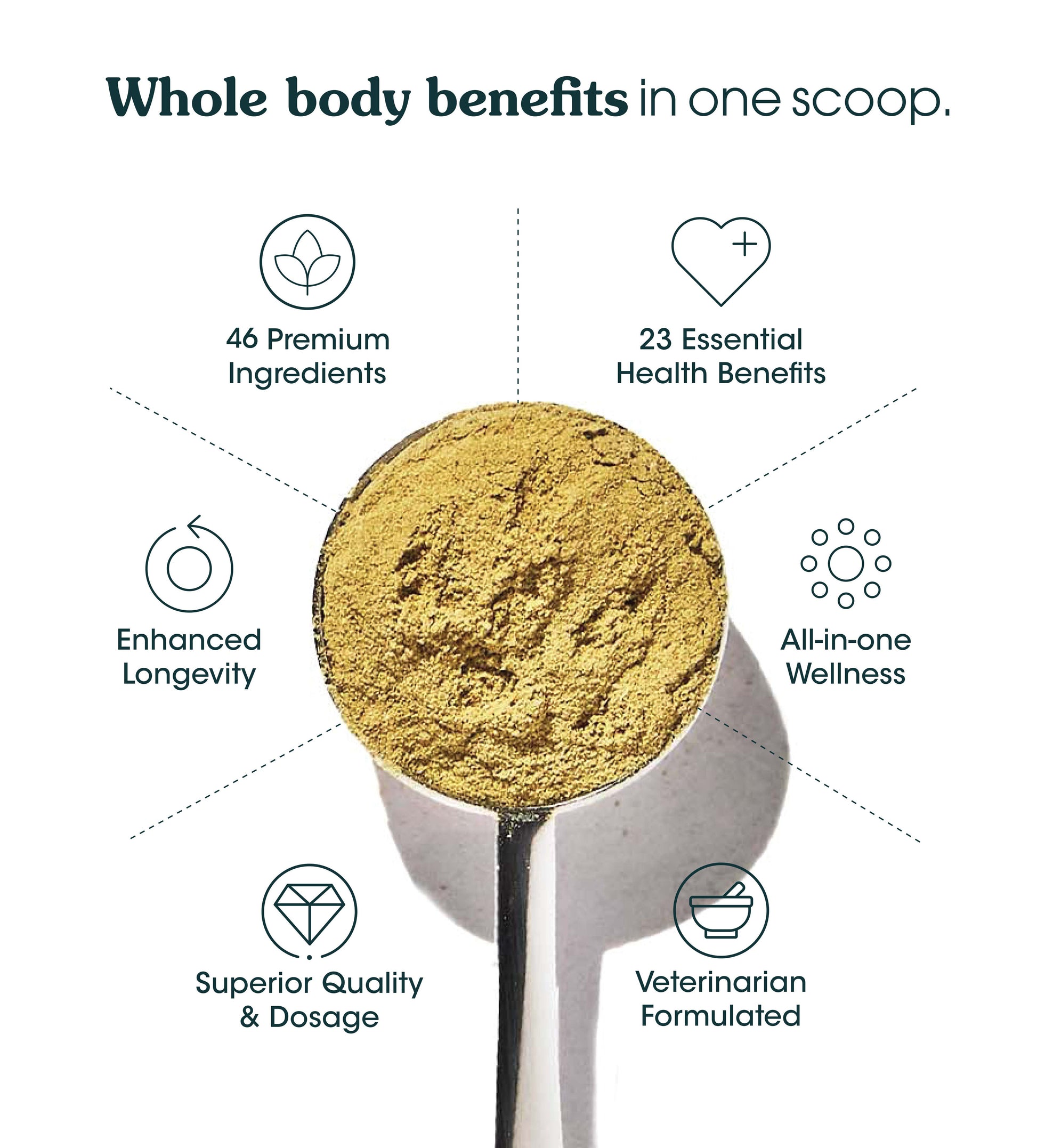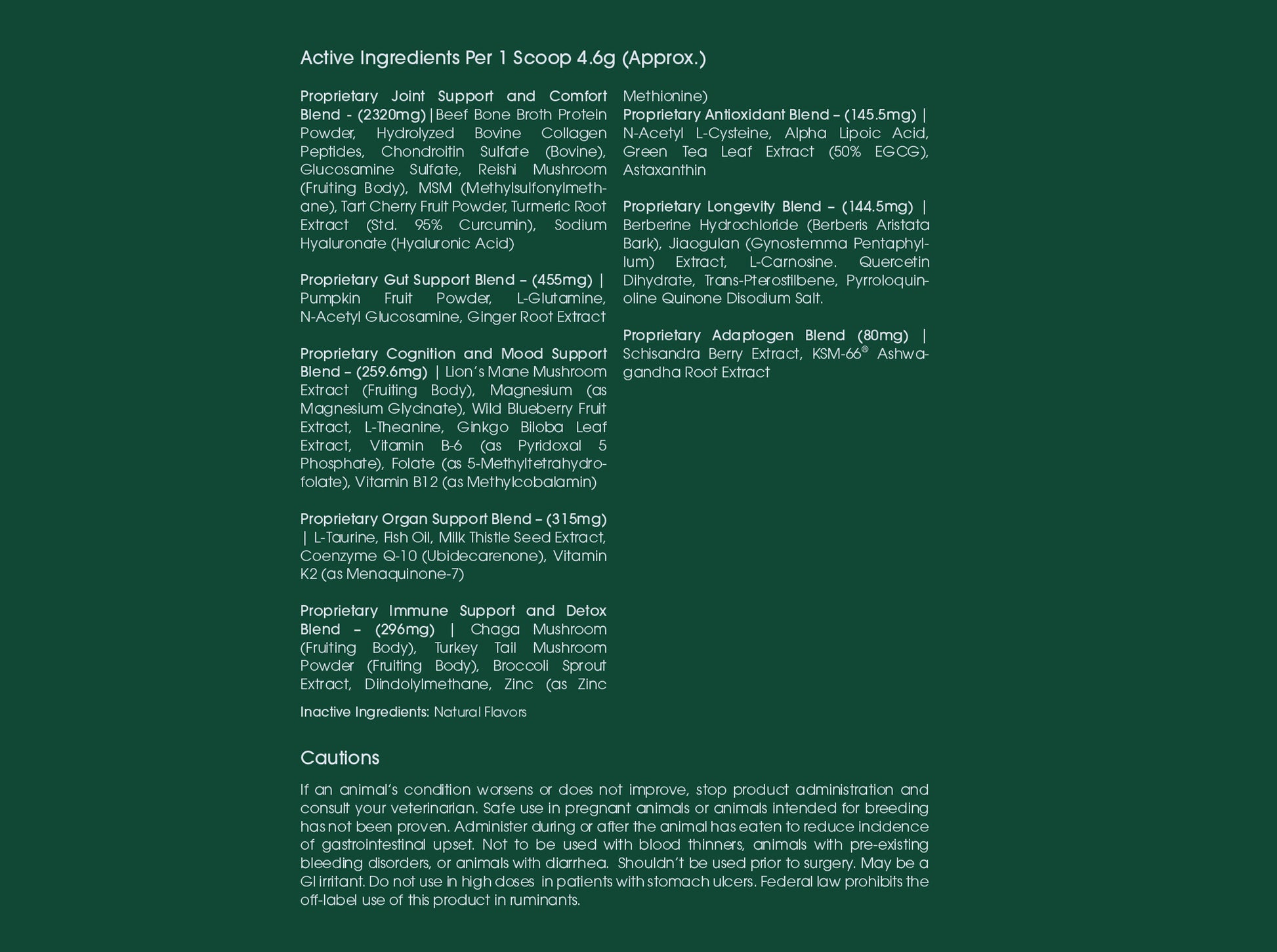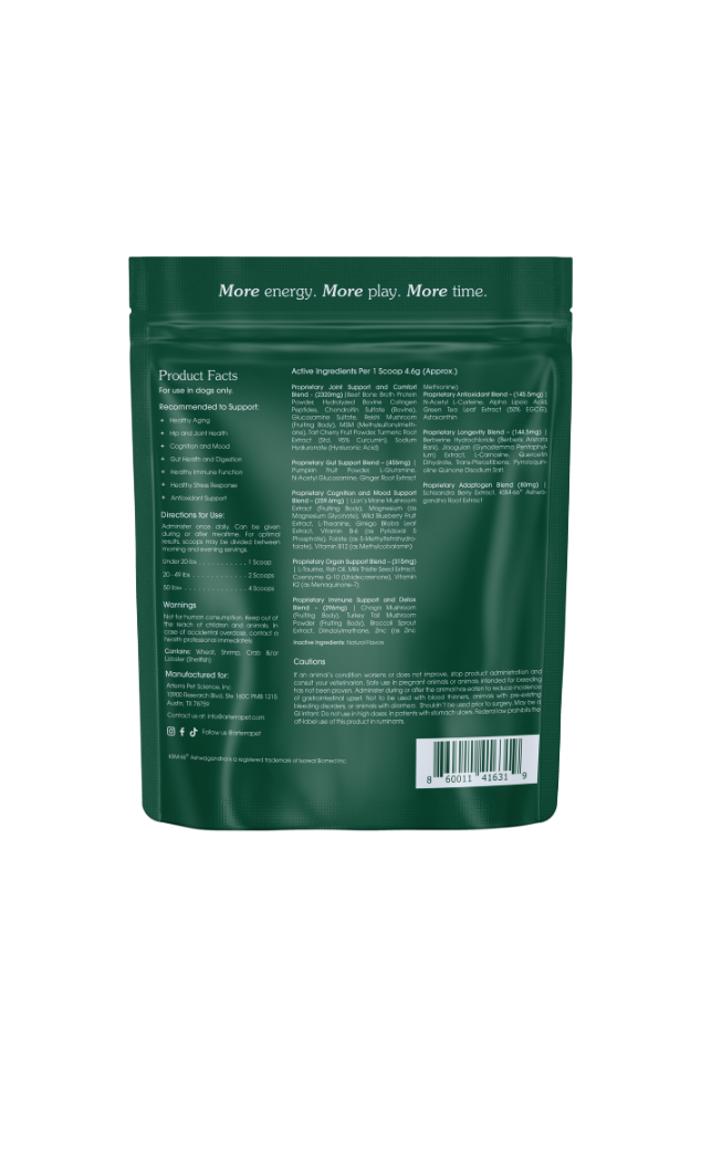 Tailored for overall well-being, this blend contains potent adaptogens that help the body adapt to stress, boost energy, and promote endurance. By regulating stress hormones and enhancing post-exercise recovery, it ensures your dog remains resilient and energetic.