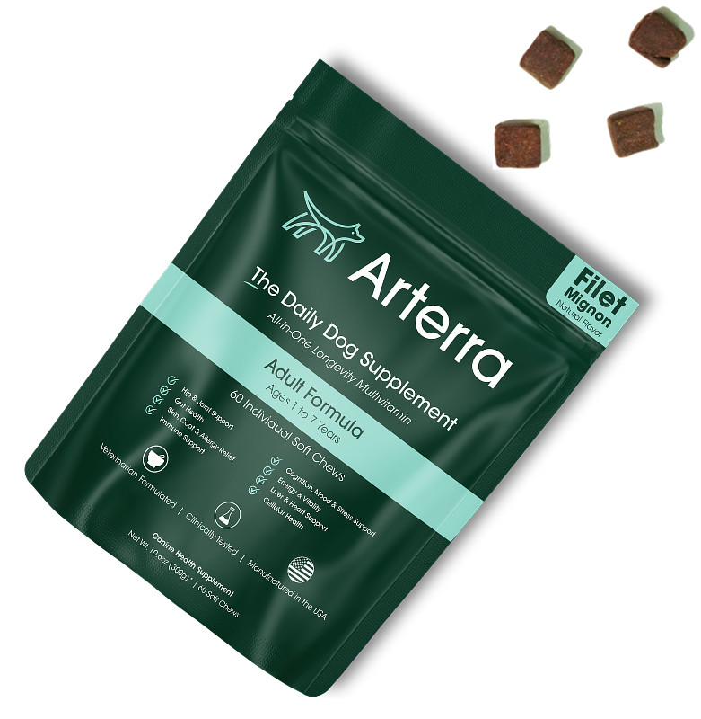 Arterra is the most advanced, all-in-one dog longevity multivitamin on the market. We've designed it to fully replace the typical off-the-shelf supplements that you might already be giving your dog, things like joint support, cognitive health supplements, gut health products, and more.