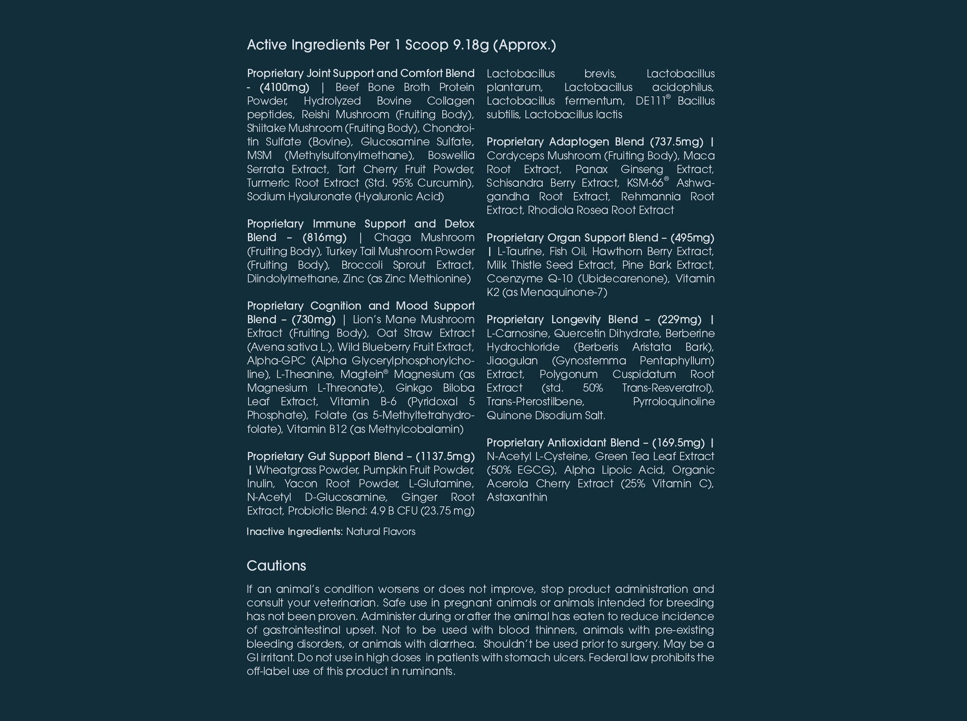 Tailored for overall well-being, this blend contains potent adaptogens that help the body adapt to stress, boost energy, and promote endurance. By regulating stress hormones and enhancing post-exercise recovery, it ensures your dog remains resilient and energetic.