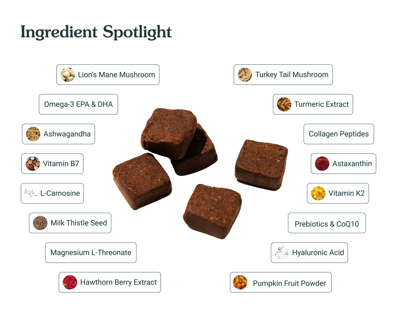 Formulated to enhance and extend the health of your dog over their entire life span by targeting key hallmarks of aging.